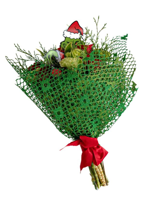 This fun and creative floral arrangement combines the warmth of red roses with the vibrant green of carnations and foliage. Wrapped in bright green mesh and decorated with details of the iconic Grinch in his Christmas hat, this bouquet is perfect for adding a touch of humor and festive spirit to the season. Ideal for those who enjoy Christmas with a unique and cheerful twist.